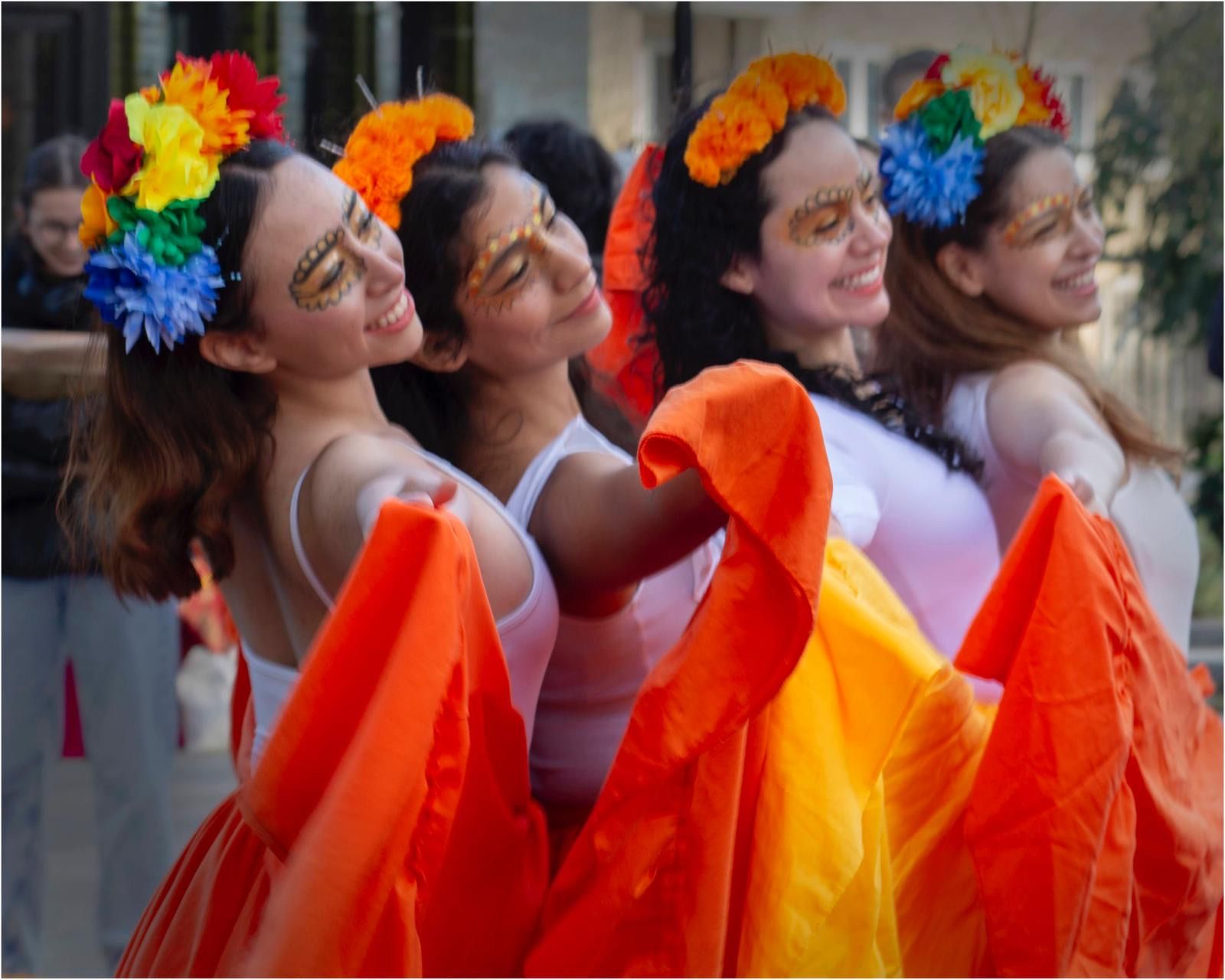 Flor del Recuerdo is a vibrant, site-specific contemporary dance performance inspired by the marigold (cempasúchil), the symbolic flower of the Mexican Day of the Dead. Developed by choreographer Alondra Galván and performed by London-based Latinx collective Bailame.x, the piece unfolded in three short choreographed segments: Entrance performance to welcome festival attendees and set the tone. Procession which guided the crowd to the Bird Cage Plaza. Ensemble performance that launched the Day of the Dead Parade. Through contemporary and folkloric-infused movement, dancers honoured the cyclical relationship between life and death, drawing from Mexican ancestral traditions and the symbolic use of marigolds as pathways guiding spirits home. The performance will explore remembrance, visibility, and celebration of identity through rhythm, costuming, and collective motion. Dancers will embody blooming marigolds, guiding spirits and audiences alike through an emotional and communal journey of memory. Performed at Columbia Rd for London's Day of Dead Festival with BailaME.X Colectivo on Nov 1, 2025